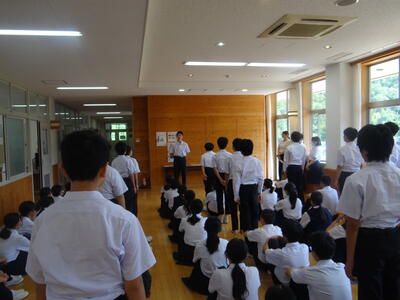 集会で、郡総体の表彰伝達が行われました。野球部、男子ソフトテニス部、女子卓球部がそれぞれ賞状を受け取りました。